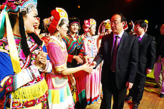 - 图、省委常委、省委宣传部部长张田欣等领导与演员亲切握手。10月19日晚,作为“七彩云南·魅力楚雄”北京行系列活动的压轴大戏“云南省庆祝新中国60华诞北京大学文艺演出”,在北京大学百年讲堂隆重举行。我州精心打造的彝族大型风情歌舞<<太阳女>>登台亮相,向首都观...