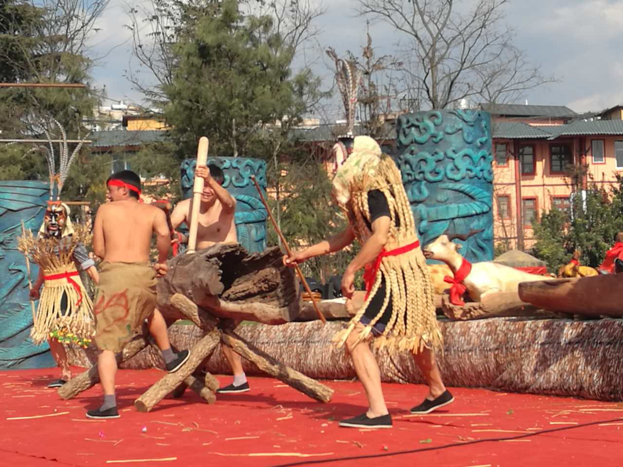 在祭虎大典上,来自云、贵、川的彝族毕摩吹响悠长的过山号,唱经祈福,祈求一年风调雨顺、五谷丰登。接下来表演的的大型彝族原生态歌舞《祭》凸显了双柏县独具特色的“老虎笙”、“大锣笙”、“小豹子笙””等彝族原生态民俗歌舞。“老虎笙”表演,整套舞蹈模仿虎的生活习性和人类生产、生活的一系列动作,具有神秘的图腾崇拜,同时也反映了浓郁的生活气息。