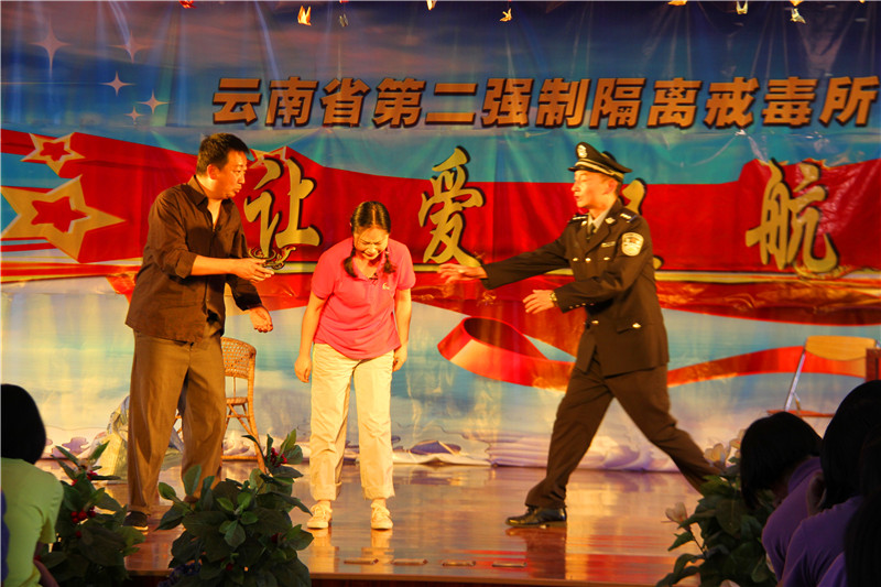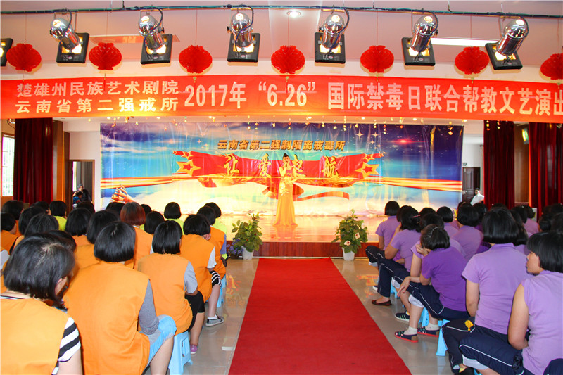 在第30个国际禁毒日来临之际,楚雄州民族艺术剧院滇剧团、彝剧团、民乐团和歌舞团的综合专家和学员,到省二所进行全面演出。据了解,省二所自1951年建所以来,该剧院所属演出团队均到省二所进行慰问性帮教演出,特别是近三所年来,楚雄州彝剧团和滇剧团,每年都到省二所禄丰分所进行帮教演出,对戒毒场所警察和戒毒学员送来了社会温暖和精神食粮,到安宁所部演出是第一次。此次演出,云南省第二戒毒所3000余人学员和500余名警察职工及其家属观看了演出。