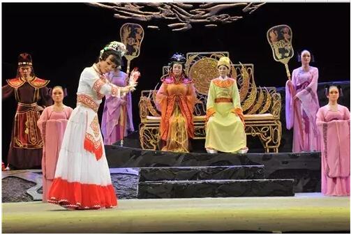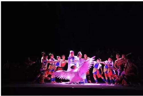 今天的三部戏有一个共性,唱词都是轻盈灵动,富有诗意。这一点,为后面的唱腔和舞蹈打下了坚实的基础。与之相应的就是非常自然而不是刻意的载歌载舞。彝剧《喝三秒》构思精巧,唱词和念白比例安排合理。不足之处在于女镇长回答葡萄的内容,太像科普,可以借题发挥增加内涵和意味,这样会增强情趣。《回家》有几个美中不足之处:普通话念白和唱腔相隔离,音乐剧的念白用普通话来表现未必合适。插叙的一段戏,建议用母女和孩子们的三方对唱更好。另外,若能把唱词里面夹杂的江阳韵和东中韵统一到家麻韵更好。《千里送鹅毛》,这部戏中的“鹅毛”,是将爱情、亲情、报答乡恩之情以及忠君之情融为一体的凝重之情,可以考虑将这部剧精雕细琢为大戏。建议把念伯高的戏加重,突出其生命历程。可赋予天鹅一种意象,报答诺亚以性命相救的恩情而飞到金殿,这样强化“鹅毛”之情。第四场的护送天鹅一场,采用纯舞蹈的手法,简洁明快。在舞台呈现上,第二场的地震一段,情景太过写实。