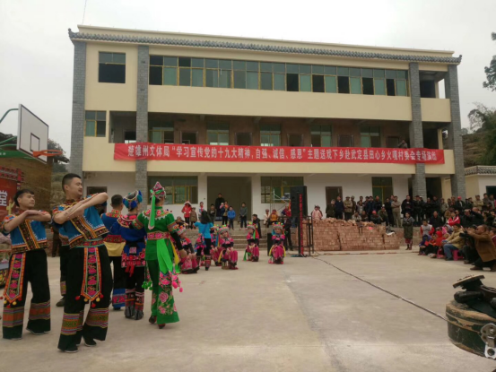 简 讯 2018年2月3日,在楚雄州文化体育局赴武定县开展2018年结对帮扶“挂包帮”“转走访”工作的同时,楚雄州民族艺术剧院也把一台“学习宣传党的十九大精神,自强、诚信、感恩”为主题的文艺演出送到了田心乡火嘎村委会,为边远山区的基层人民群众送去了温暖和祝福。演出当日正逢寒流降温天气,演员们不畏严寒,身着薄衣短袖,在接近零度的气温下热情饱满的为村民们进行演出。演员们良好的精神面貌、敬业奉献的精神,感染和感动着每一位观众的心,演出活动受到了大家的热烈欢迎和称赞。(州民族艺术剧院 尹丽荣) 说唱《喜庆十九大·彝乡开新篇》 四重唱《共筑中国梦》 |