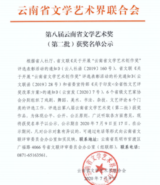 文旅头条讯(记者 李银娟 文)近日,云南省文学艺术界联合会发布《第八届云南省文学艺术奖(第二批)获奖名单公示》,楚雄州彝剧小戏《喝三秒》入选云南戏剧山茶花奖。此次获奖名单公示包括云南戏剧山茶花奖、云南舞蹈金孔雀奖、云南美术奖、云南书法奖、云南杂技金丝奖、云南文艺评论奖等六个类别,公示期自2020年7月9日至17日。据悉...